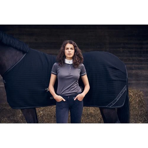 Elegant and feminine T-shirt in functional sweat absorbent and antibacterial stretch fabric that you will come to wear all summer. Decorated with a delicate chain detail along the buttons. The T-shirt is available in white and grey. Collar in cotton.