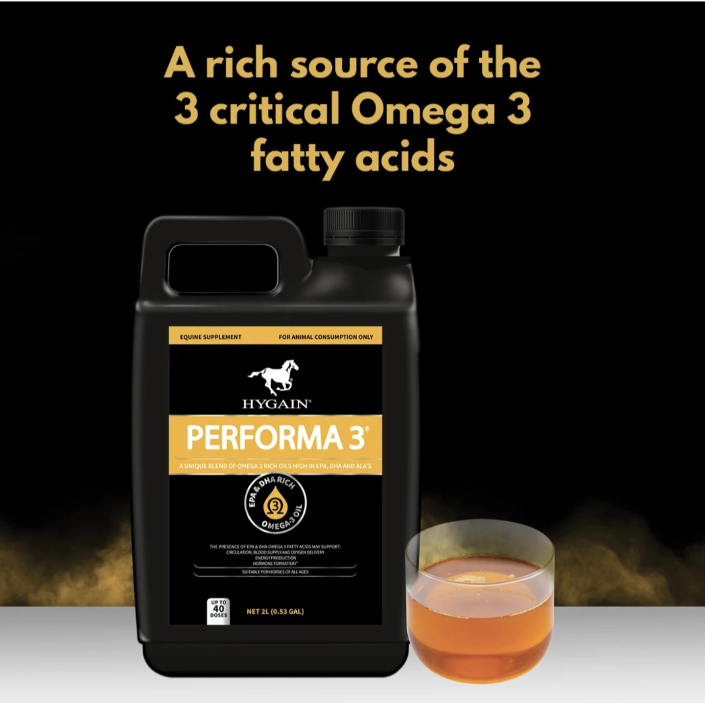 HYGAIN PERFORMA 3® is a rich, natural source of Omega 3, 6 & 9 fatty acids. By combining Omega 3 rich vegetable and fish oils with added garlic, PERFORMA 3® contains high levels of usable EPA and DHA’s.