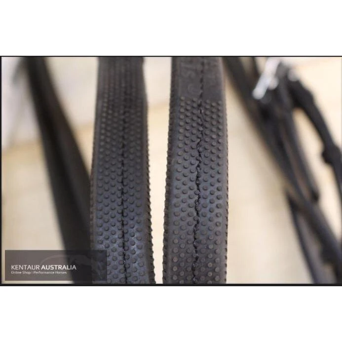 The Kentaur ‘Classic’ Bridle with Rubber Reins is a beautiful leather bridle with a delicate padded noseband. This bridle has a simple yet stunning decoration on the browband, and the Hanoverian noseband is fully removable. A superb piece of craftsmanship, it has been handmade using buttery soft Italian leather.