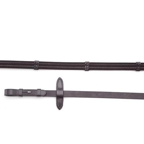 These innovative reins are made from a combination of strong nylon webbing, rubber and the finest quality Italian leather. The webbing has rubber treads woven within it, to heighten grip for the rider. To aid grip even further, leather ‘grips’ have been placed at regular intervals along the length of the webbing.